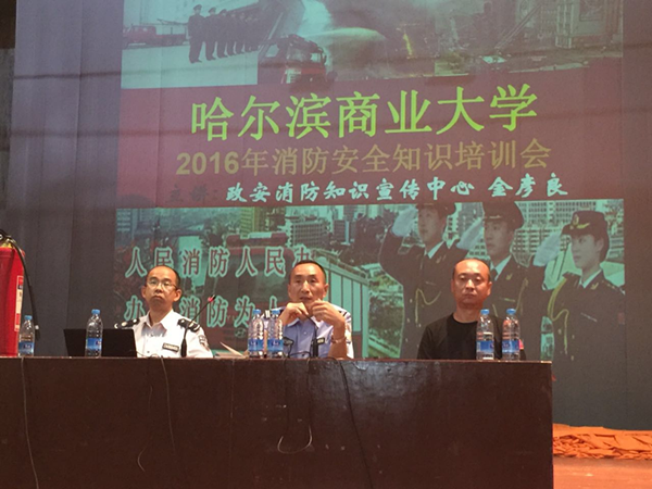9月6日,我校隆重举行2016级新生安全教育大会。哈尔滨市公安局共乐派出所所长徐国臣、中源派出所副所长马春光就我校治安情况分别在南北校区讲解了如何知法、懂法、防盗、防骗、防伤害等相关知识;松北消防大队高贵庭教官、政安消防办公室宣传中心金彦良教官讲解了初级火灾的扑救、灭火器的使用方法、如何火场逃生等知识,并组织了部分新生对如何使用灭火器进行了室外演练,提高了学生消防实践技能,效果良好。